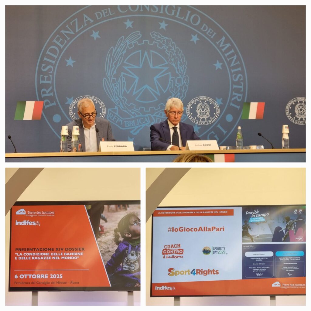 La Fondazione Sportcity, da sempre partner di Terre des Hommes per una società migliore, è parte attiva del progetto “Indifesa”, che da 14 anni vuole sensibilizzare le istituzioni e l’opinione pubblica sulle gravi violazioni dei diritti delle bambine e delle ragazze. Il presidente di Fondazione Sportcity Fabio Pagliara ha preso parte nei giorni scorsi all’iniziativa Sport4Rights, progettato insieme a Fondazione EOS – Edison Orizzonte Sociale e Specchio Magico svoltasi presso la Sala Polifunzionale della Presidenza del Consiglio dei Ministri alla presenza del Ministro Andrea Abodi, volta a rilanciare il valore dello sport come luogo di crescita, prevenzione e rispetto.