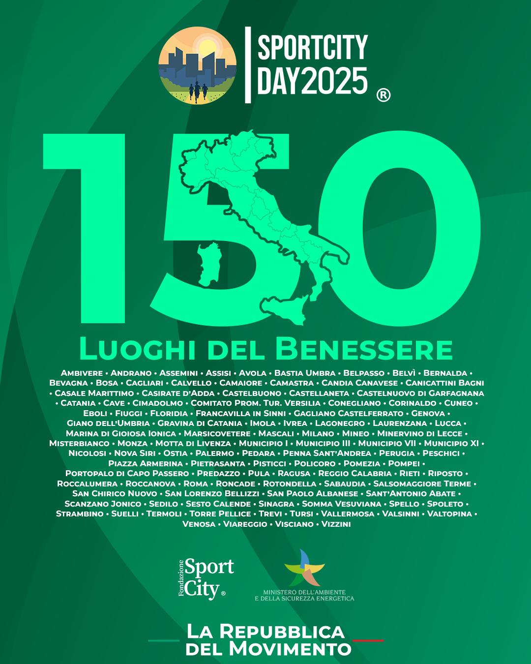 Lo SportCity Day 2025 si è tenuto il 21 settembre 2025 in 150 luoghi del benessere italiani: un numero record per la manifestazione che, quest’anno ha coinvolto oltre 600.000 persone in tutta Italia!